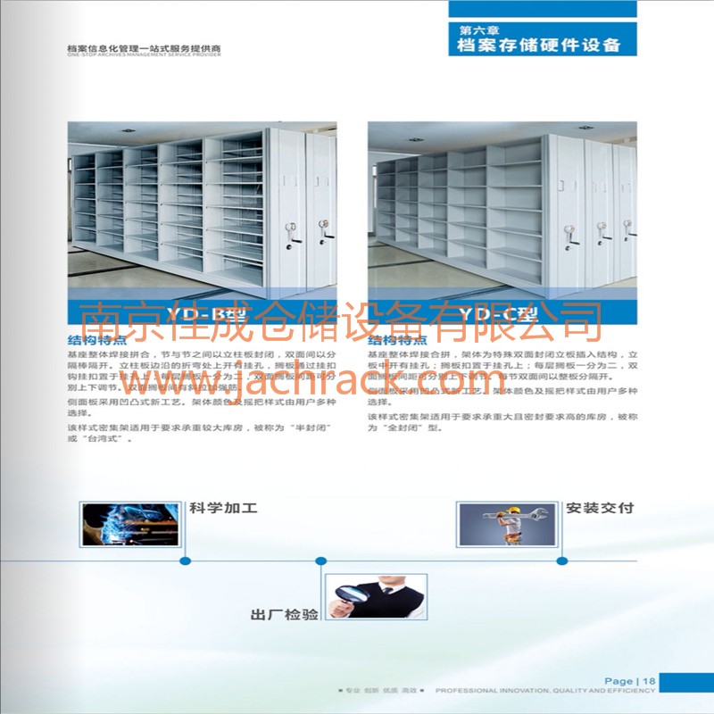 v活动式密集架是在传统档案架的基础上采用轨道把多个架列密集到一起,使档案在单位面积上的存贮量提高,节省面积可达50%以上,并有防火、防盗、防尘等优点。但这种档案架造价高,增加了建筑负荷,增加了库房建筑的投资,调用档案不如一般的档案架方便,如遇特殊情况,抢救档案比较困难。