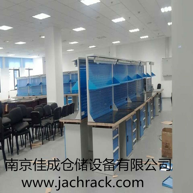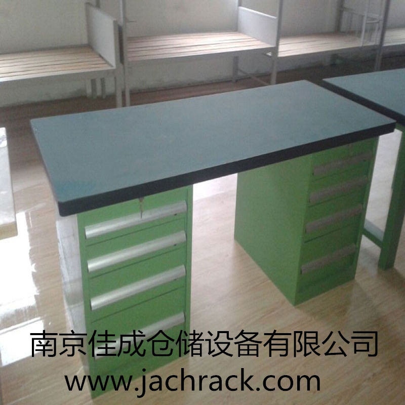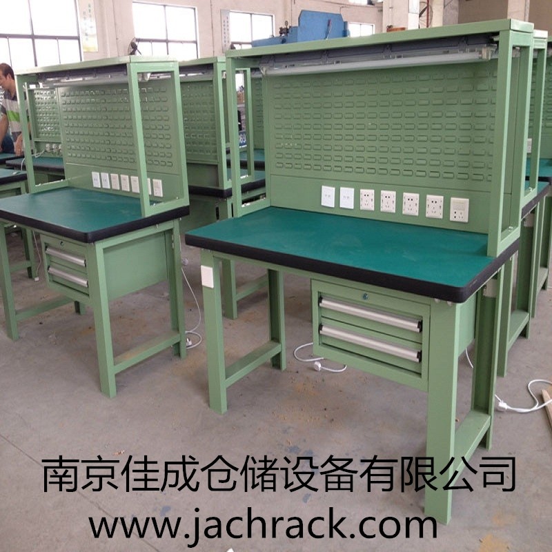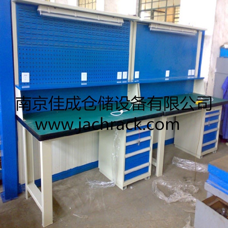 工作台适合于模具、钳工、检测、维修、组装等各种不同应用场合,具有良好的耐腐蚀性,耐脏性,抗冲击性和承重能力强。桌面经特殊处理,具有防腐、抗冲击力强等特点,多种桌面的选择,可配合不同的使用要求;所配置的抽屉、柜门方便使用者存储工具;桌角上预留电源孔,方便安装电源插座。工作台(桌)分为轻型(),中型和重型工作台(桌)及特制的工作台。可根据需要灵活地配置各种吊柜、单柜、双柜等,可加装挂板,电器板,灯顶板、调节脚杯,轮子,搁板等桌上部件,具有多种选择,能够满足各种工位的需求。